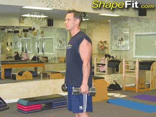 立 姿 ( 或 坐 姿 ) , 手 持 哑 铃 垂 于 体 侧 , 掌 心 相 对 , 上 臂 紧 贴 体 侧 , 肘 关 节 是 惟 一 运 动 的 关 节