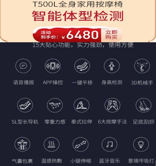 1、迪斯T500L:这款价格5980元,非常适合老年人使用,因为它可以蓝牙语音链接天猫实现语音控制,也就是父母在使用的时候,无需使用繁琐的物理有线遥控器,只需要发出指令,按摩椅就可以按着用户的需求开启程序按摩。其有15大功能,如下图示。