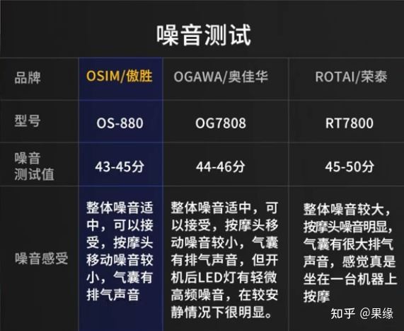 在噪声的测试中,荣泰RT7800的声音最大,气囊会有很大的排气声,体验的时候会随时提醒你,你是在一台机器上。奥佳华的噪音水平则适中,不过LED灯有轻微的高频噪声,有的时候比较扰人。奥胜OS880的噪音水平也是适中,按摩头移动和气囊排气的声音都比较小。