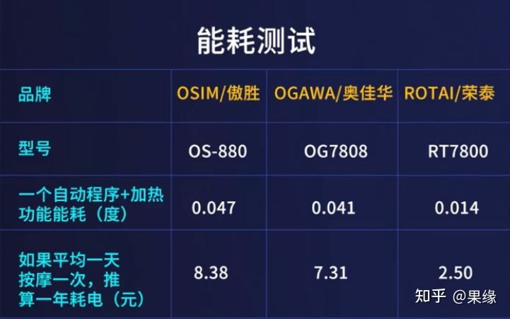 能耗方面三台按摩椅的能耗都比较低,其中荣泰最省电,每天按一次来计算,一年的电费也就2块5毛钱。