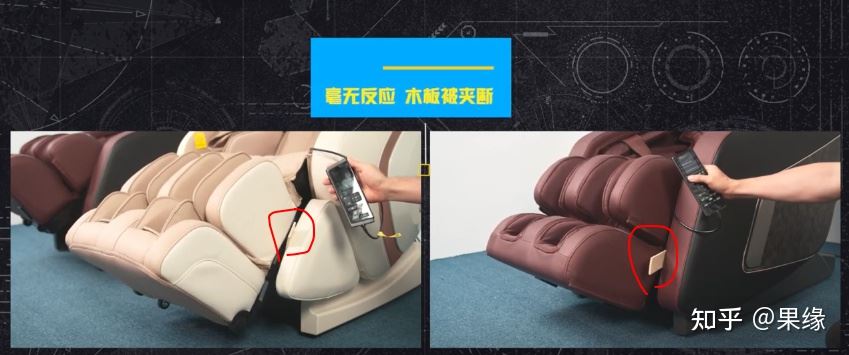 我们能用木条模拟异物来做了一个测试,测试的结果比较可怕,只有傲胜OS880有防夹功能和遥控器的报警,另外两台按摩以后都毫无反应,甚至还夹断了木板。安全性这一点我觉得傲胜还是做的比较好。