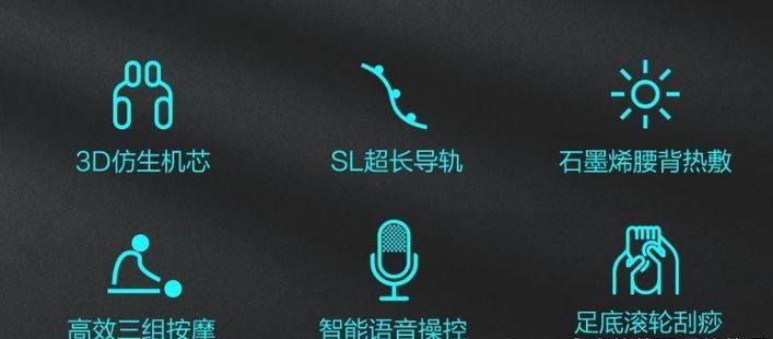 - 特色功能有12段颈肩按摩,小腿4D机械手和双重气囊按摩,小腿两侧还能加高加厚以及延伸,6档的力度调节,背部,腰部以及足底恒温热敷,三挡零重力设计;