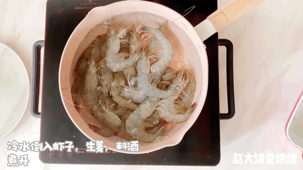 2、冷水放入虾子、生姜和料酒去腥,煮开