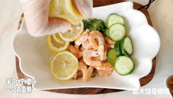 6、香菜、虾仁、柠檬片、黄瓜摆盘,加入半个柠檬汁,一个百香果