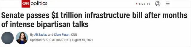 据CNN报道10日,美国参议院通过了一项历史性的、总额1.2万亿美元的党派基础设施投资法案。