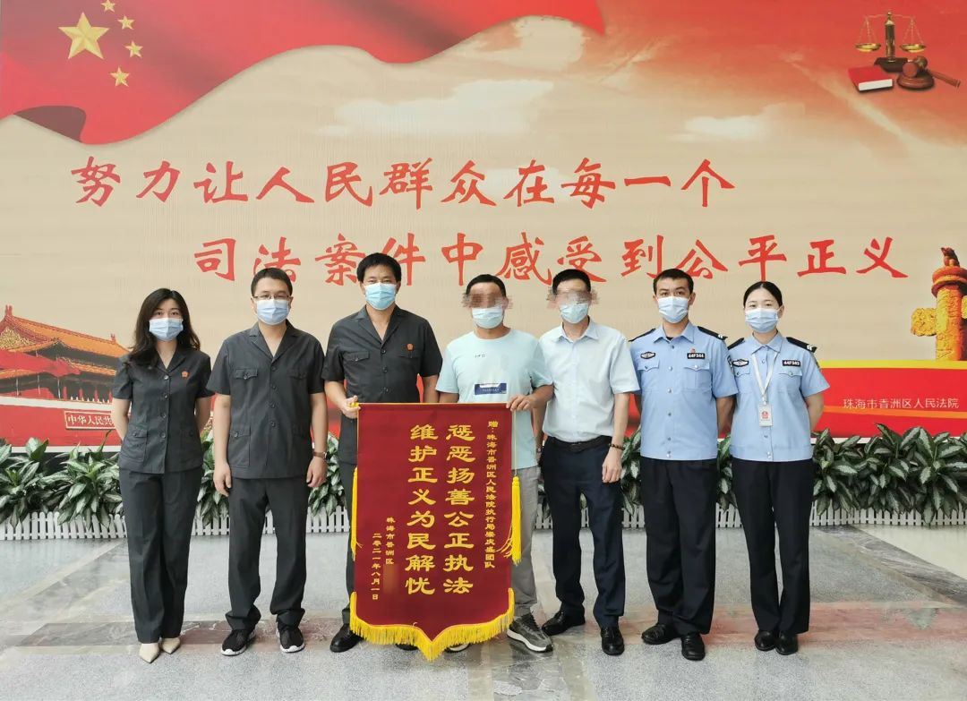 2021年8月9日下午,来自福建的申请执行人将一面“惩恶扬善公正执法维护正义为民解忧”的锦旗送到香洲法院执行局特别执行团队手中,表达真挚的感谢。