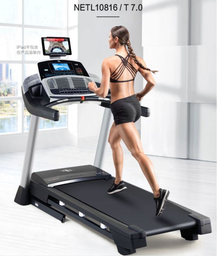 10816/T7.0爱康家用跑步机:2.75CHP商用马达,0-20km/h的速度范围,0-10%电动坡度调节,51cm跑带宽度,内置20款训练程序,FlexSelect™可调式减震技术,兼容iFitCoach技术及训练程序,最大承重300斤,跑步机尺寸188*91*160cm。